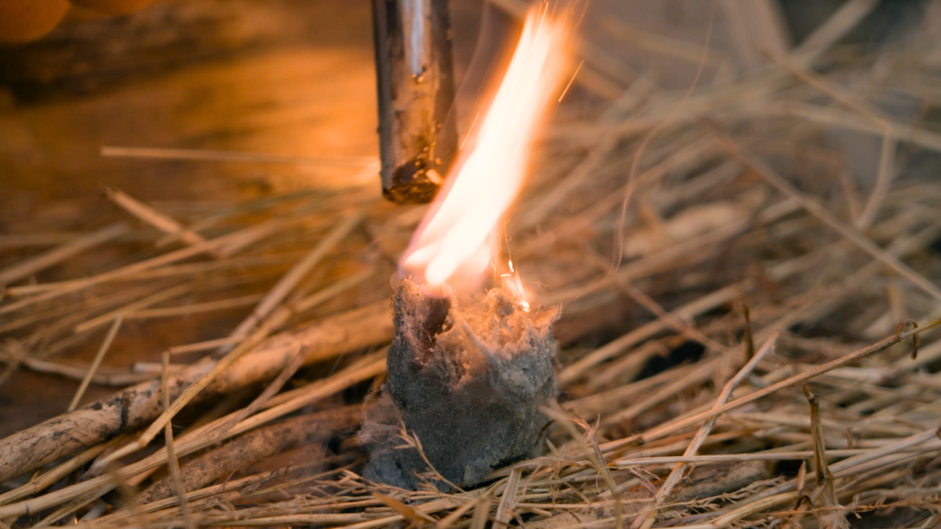 Use a dime-size portion of clay for dry kindling, larger for wet kindling. Make sure to expose the fibers, place in the center of a “nest” of tinder/kindling, and light (we prefer a ferro rod). You can also mold to the end of a stick to make the ultimate match!